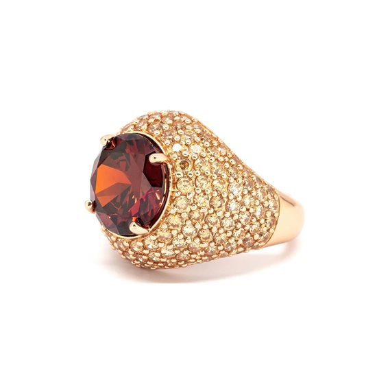 Anello con pietra centrale tonda, realizzato in argento 925 con galvanica rodio rosa, pavè in zirconia cubica champagne e cristallo rosso granato a contrasto. Larghezza: 19x24 mm Altezza: 30 mm Diametro Pietra Centrale: 12 mm