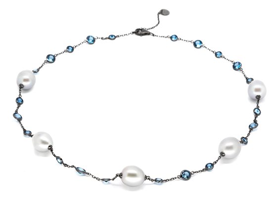 Girocollo con pietre tonde in spinello sintetico azzurro e perle di fiume, realizzato in Argento 925 con galvanica rodio nero. Lunghezza: regolabile da 41 a 44 cm Diametro pietre tonde: 4/6 mm Perle: 10x8 mm Tipo di Chiusura: Con moschettone