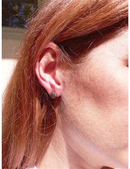 Argento 925 parzialmente ricoperto dallo speciale materiale POLVERE DI SOGNI. Si tratta di micro-particelle ottenute, con la nanotecnologia, dalla lavorazione di materiali naturali minerali, a seconda delle caratteristiche e dei colori che si desiderano ottenere, e hanno una forma esagonale per esaltare l'effetto ottico della riflessione