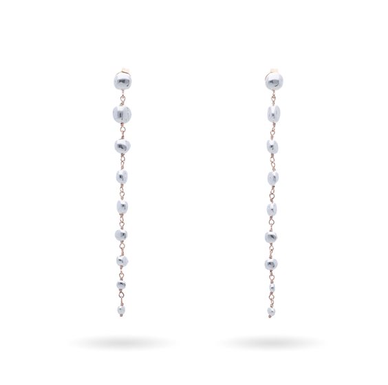 Orecchini pendente con sassolini irregolari in Argento 925 ammagliati in Oro Rosa 9kt. Collezione ispirata dalla leggerezza dell’estate, dal luccicare dei raggi del sole sulle sponde della Riviera e dalla sinuosità delle onde.